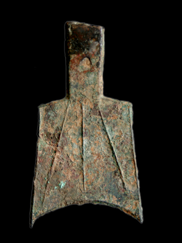 斜肩弧足空首布指春秋战国间(约公元前6~公元前4世纪)周王畿及晋、郑两国所铸之币。形与垂肩弧足布近,均为长銎、弧足;所不同者,在于垂肩布两肩下垂,足布稍张。斜肩布铸量及品种都较少,分大、小二型,迄今发现面文有武、卢氏、三川釿、武安、武采等5种,其中以【武】字布较常见。
