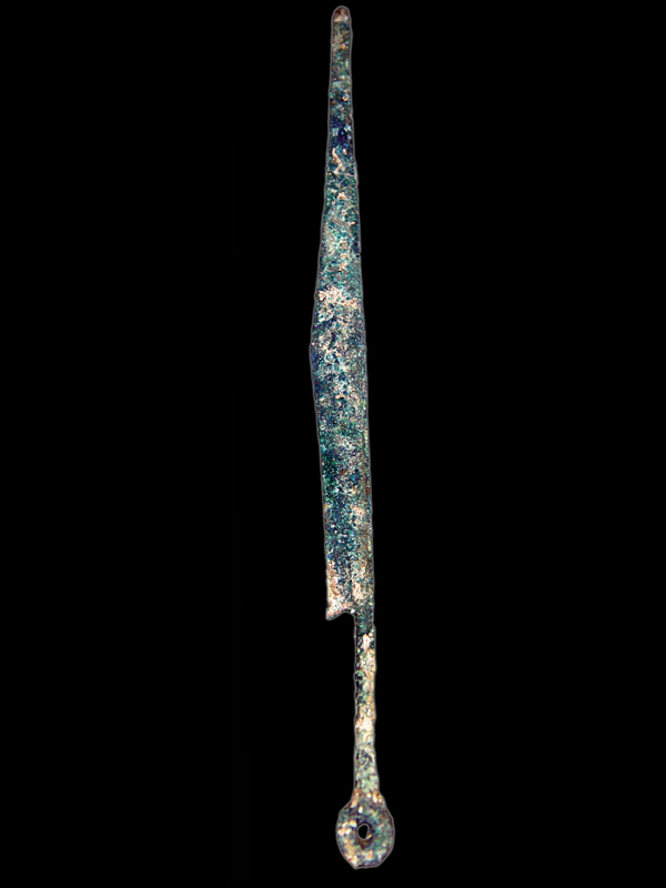 针首刀又称锐锋刀,铜质不精,制作也粗,文字简单,或无文字。研究者向来认为当属燕国所铸,其特点是刀尖细长如刺,尖得像针一样,刀身也比较短而薄,刀柄端部有环,柄身有筋,每枚重量自5克至9克以上不等。其早期所铸形体较大,晚期则过于轻小。