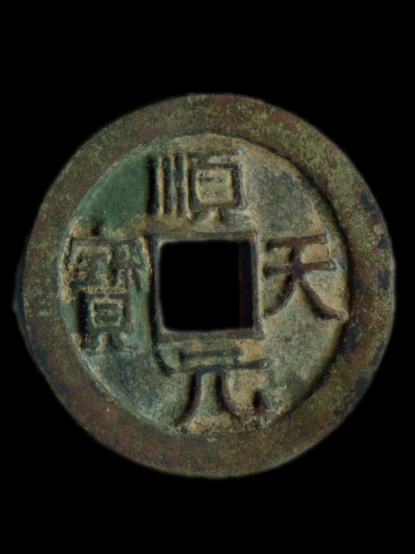 顺天元宝唐朝安史之乱叛将史思明于乾元二年(公元759年)所铸。面文为【顺天元宝】,形制与【得壹元宝】相同。铸量较多,有【顺天易得,得壹难求】之说,但今存已少。背上有月纹及星月纹,光背者少。乾元二年(759年),史思明攻占洛阳,自号【大燕皇帝】,因军事上不顺利,到处被唐军围追堵截,便迷信于【得壹】钱是不祥之兆。这样,很快就废止并收回了得壹钱,新铸【顺天元宝】钱,【顺天】形制、比值、色泽均同于得壹元宝。铸量较多,但今存已少。推行新钱对老百姓而言,是换汤不换药,再次身受其害,苦不堪言。761年,史思明被其子史朝义所杀。