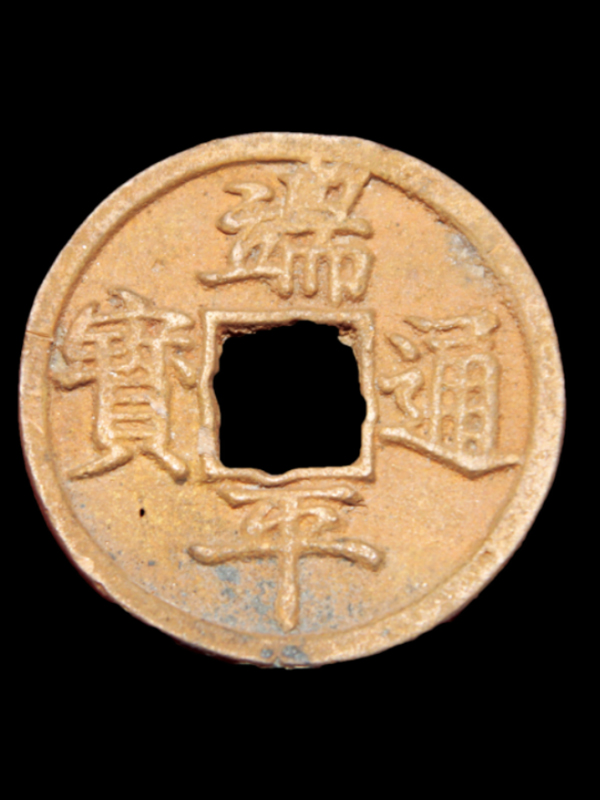 端平通宝系宋理宗赵昀端平年间(公元1234~1236年)铸,钱文直读。有铜、铁币质。铜品仅有折五型大钱,面文楷书,光背,有【长脚平】、【短脚平】等多种版别,钱径约36毫米,重15克左右。铁钱有小平、折五等,背文纪年记监。《宋宗题铭》中提到对【端平】年号的解释颇显现了当时人们的不满情绪:【端平端平,坐守太平,奸邪专政,民愤难平】。反映了当时该钱币铸造的年代特点:当时的货币发行量超过三亿贯,物价飞涨,奸臣当道,朝政混乱。