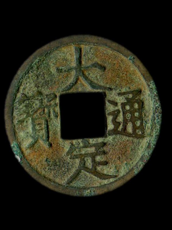 大定通宝系金世宗完颜雍大定年间(公元1161~1189年)铸,钱文仿瘦金体书。版式有小平,折二两种,币制包括铜、铁钱。【大定通宝】钱,造型简练、形貌大方、字仿【瘦金】,精美程度比【大观通宝】有过之无不及。其中平钱是金代铸期最长、铸量最大、版别最多、鼓铸最精的一种钱币。折二大钱铸量较少,色灰白,世传其钱料微含银。除光背外,尚见有背【申、酉】及星月纹者,申酉在五行中属金,意为金之国号。