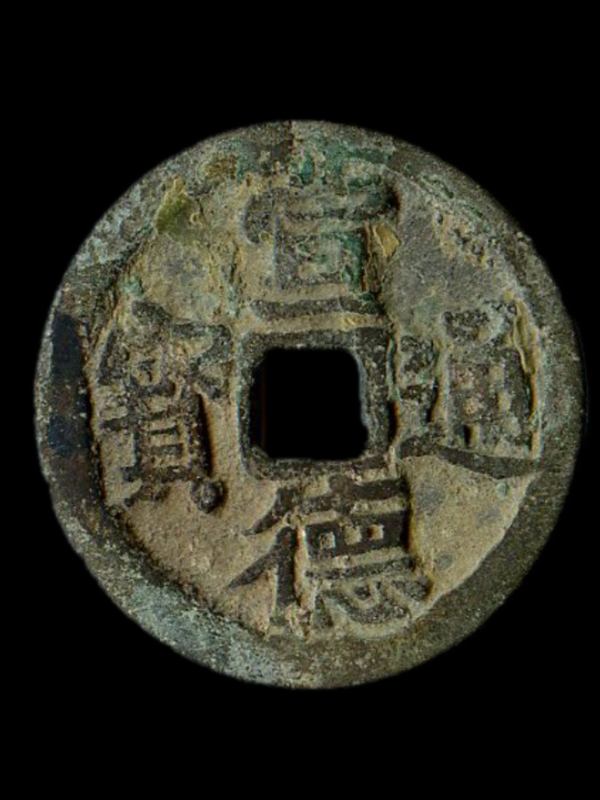 宣德通宝系明朝宣宗,朱瞻基宣德八年(公元1433年)铸造,钱文楷体,直读。铸量少于永乐通宝,版别简单,逊于永乐钱。版式为小平钱,光背,径约24毫米,重约3克。宣德通宝有一种【德】字偶有省去一横的,称作【省一宣德】,比较罕见。