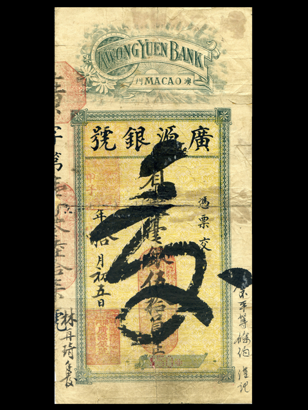 澳门广源银号银元票 票名:澳门广源银号银元票 类别:流通票 发行单位:澳门广源银号 票面年份:公元1924年 面额:50元 票面地名:澳门 装饰图文:绿黄色,正面标有广源银号的英文字样