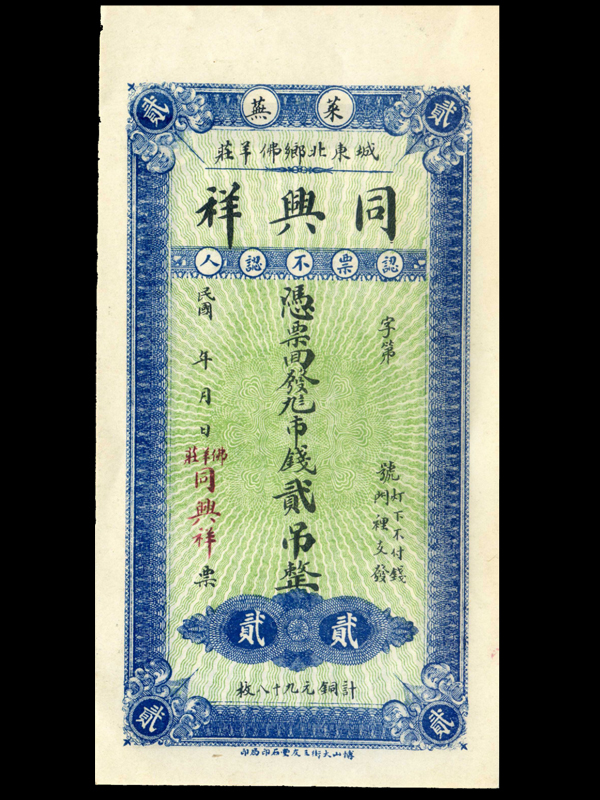 名称:票帖“同兴祥” 面额:两吊 签发时间:未填写