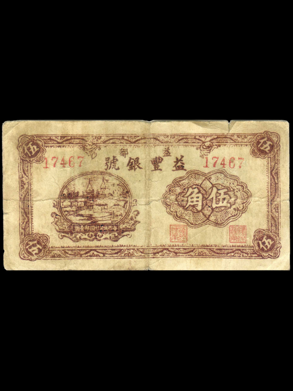 名称:益都益丰银号票帖 面额:五角 钞票样式:印有票号、面额等信息及“每十角兑付国币一元”字