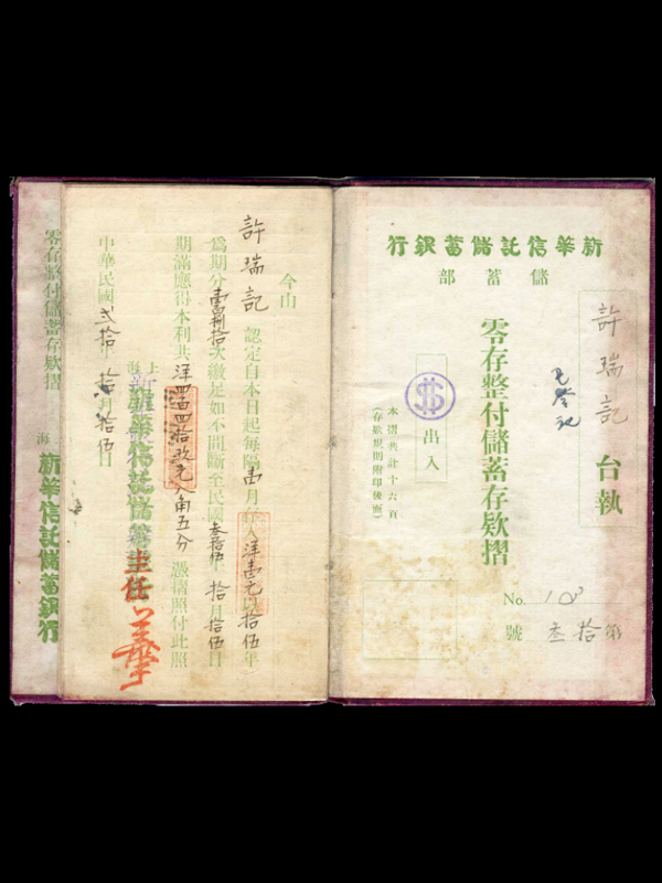 名称:零存整付储蓄存款折 发行机构:新华信托储蓄银行储蓄部 户名:许瑞记 发行时间:1931年 新华信托储蓄银行由中资中国银行、交通银行于 1919年联合创办,原名新华储蓄银行,1931年改组后更名为新华信托储蓄银行。1952年关闭。