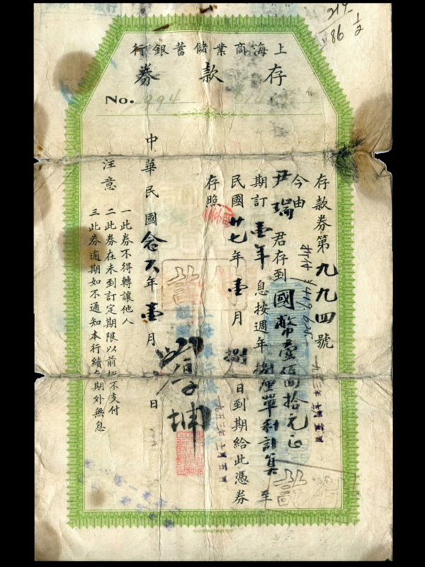 名称:存款券 发行机构:上海商业储蓄银行 金额:国币140元 发行时间:1937年 上海商业储蓄银行,成立于1915年6月2日。成立之初,因规模在上海银行界中十分渺小,被戏称为 “小小银行”,而该行发展之迅速,在我国银行业中,却是首屈一指的。到1926年时,资本增为250万元,资产总额超过4,700万元。其后最高时分支机构达111个,职工 2775人,存款总额近2亿元,均属私营银行首位。1949年,随国民党政府迁往台湾。