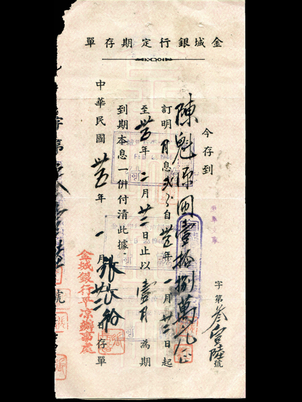 名称:金城银行定期存单 发行机构:金城银行 发行时间:1946年 金城银行成立于1917年,总行设于天津,与盐业银行、 中南银行、大陆银行被金融界统称为“北四行”。