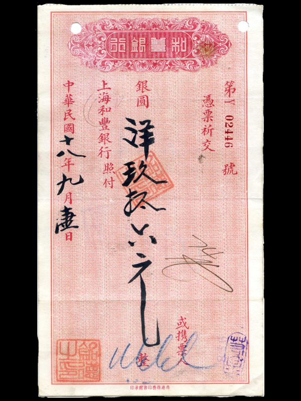 发行机构:上海和丰银行支票 发行时间:1929年 面额:银元96元 和丰银行1917年1月创建于新加坡,成立后积极向海外扩展业务,除了在马来亚的几个城市、香港与上海设立分行外,也在世界的主要城市设立了48个代理处。1932年10月,和丰银行与华商银行、华侨银行合并为华侨银行。
