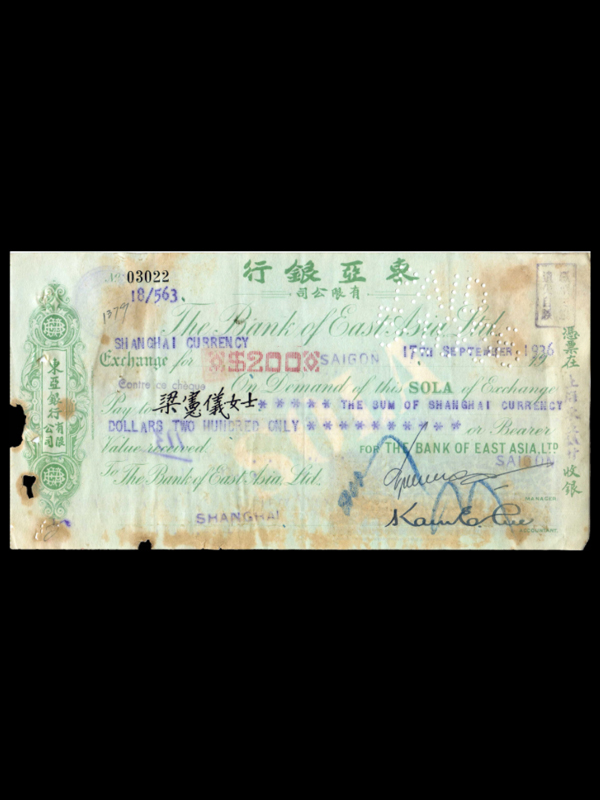 名称:东亚银行支票 发行机构:东亚银行 签发时间:1936年9月17日 户名:梁宪仪女士 面额:200美元 东亚银行于1918年在香港成立,1920年,东亚银行已看准国内市场庞大的发展潜力,于上海成立首间分行。