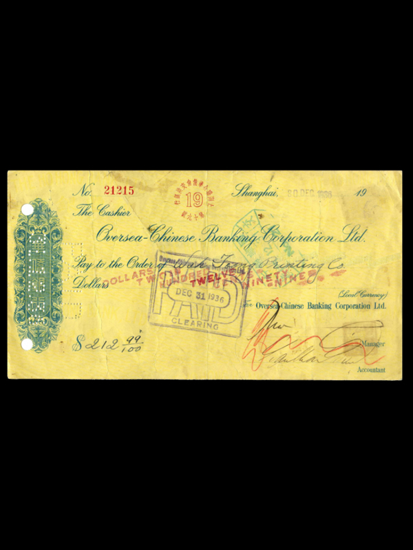 名称:华侨银行支票 签发机构:华侨银行 面额: 212.99美元 签发时间:1936年 华侨银行于1932年在新加坡创建,是由华商银行(1912年创办)、和丰银行(1917年创办)以及华侨银行(1919年创办)三大福建帮银行合并而成。
