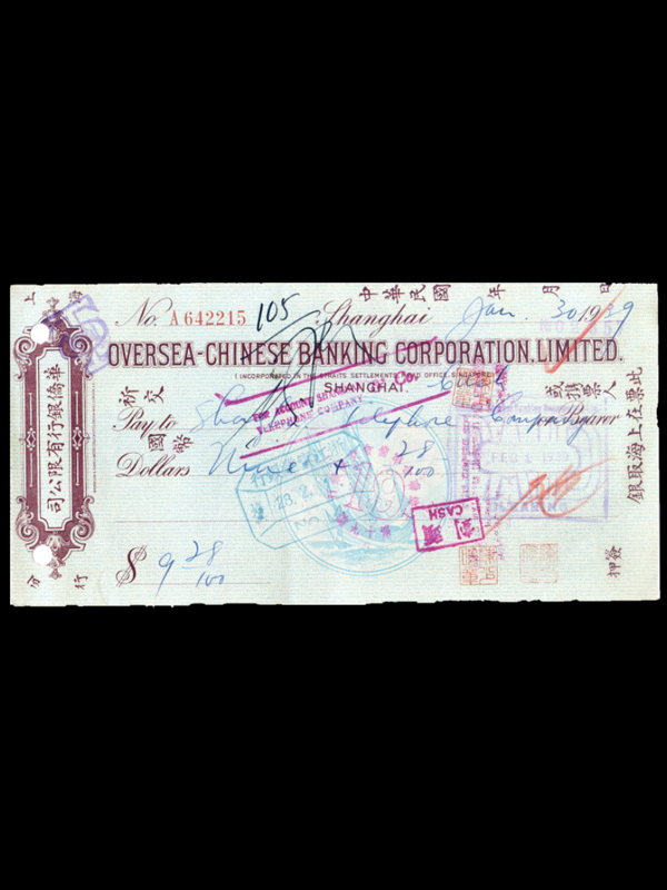 名称:华侨银行支票 签发机构:华侨银行上海分行 面额:9.28美元 签发时间:1937年 华侨银行于1932年在新加坡创建,是由华商银行(1912年创办)、和丰银行(1917年创办)以及华侨银行(1919年创办)三大福建帮银行合并而成。