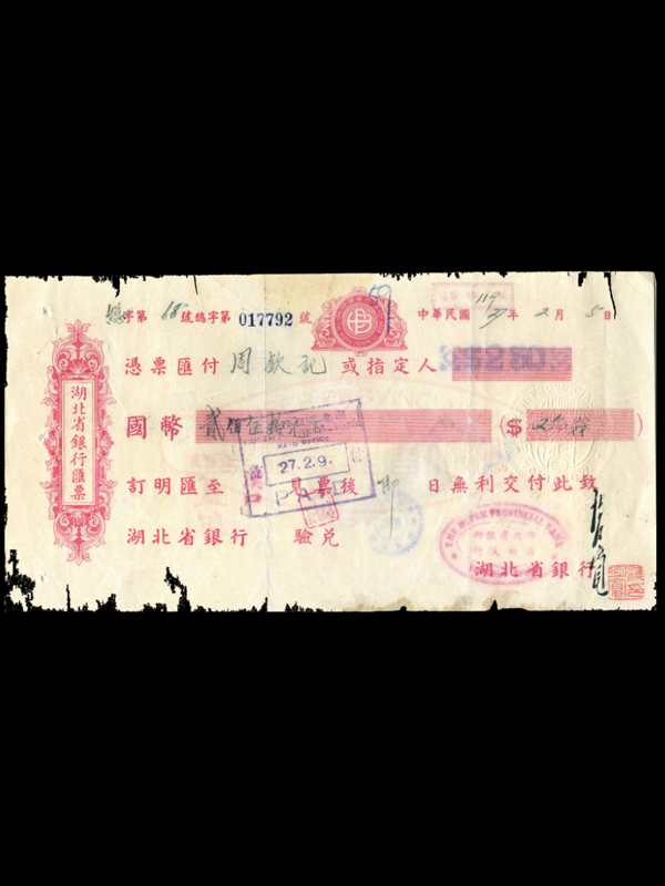 名称:湖北银行汇票 签发机构:湖北银行 面额:国币250元 签发时间:1938年2月5日 1928年3月,辛亥名人张难先就任湖北省财政厅厅长后,为解决当时湖北金融的恐慌,促进湖北经济的发 展,决定筹建湖北省银行。1928年11月 1日在汉口江汉路28号湖北银行正式成立。湖北省银行当时的职能以调剂地方金融、辅助地方经济建设发展为主旨,经营普通商业银行业务,代理省库、经营公债、库券的发行。