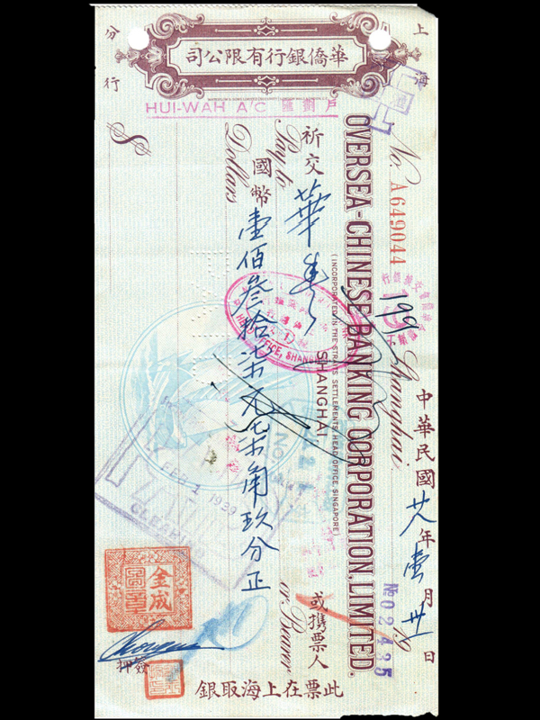 名称:华侨银行支票 签发机构:华侨银行上海分行 面额: 137.79元 签发时间:1939年 华侨银行于1932年在新加坡创建,是由华商银行(1912年创办)、和丰银行(1917年创办)以及华侨银行(1919年创办)三大福建帮银行合并而成。