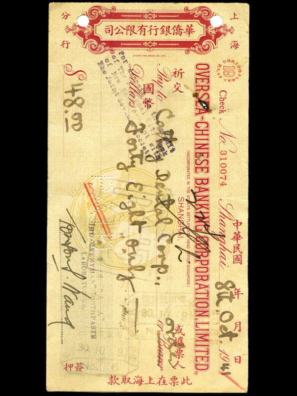 名称:华侨银行支票 签发机构:华侨银行上海分行 面额: 48美元 签发时间:1941年 华侨银行于1932年在新加坡创建,是由华商银行(1912年创办)、和丰银行(1917年创办)以及华侨银行(1919年创办)三大福建帮银行合并而成。