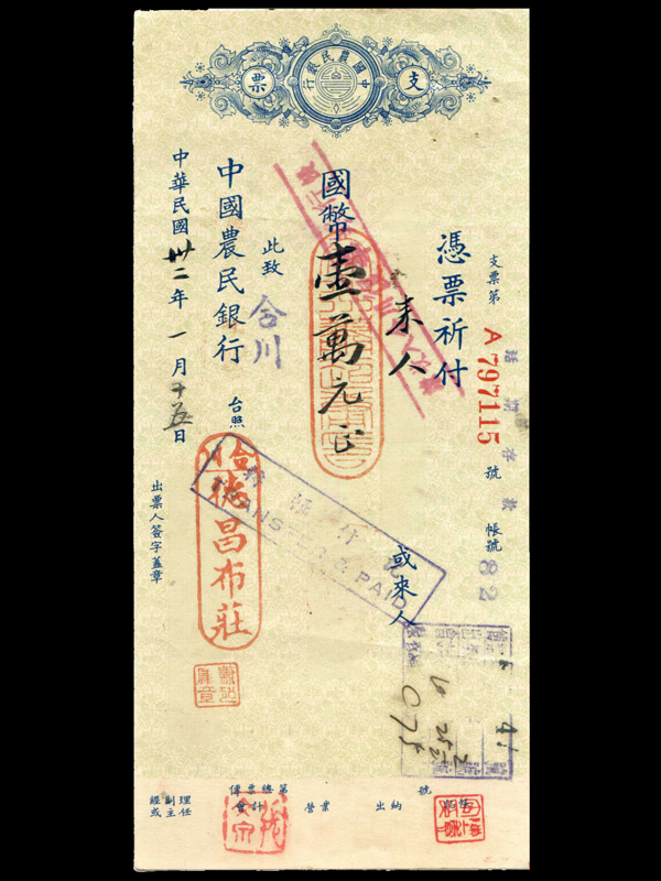 名称:中国农民银行支票 发行机构:中国农民银行 签发时间:1943年1月15日 面额:国币一万元 中国农民银行成立于1935年,其前身是豫鄂皖赣四省农民银行,总行设于汉口,同年,国民政府宣布中国农民银行为国家银行之一,继中央银行、中国银行、交通银行之后发行“法币”。