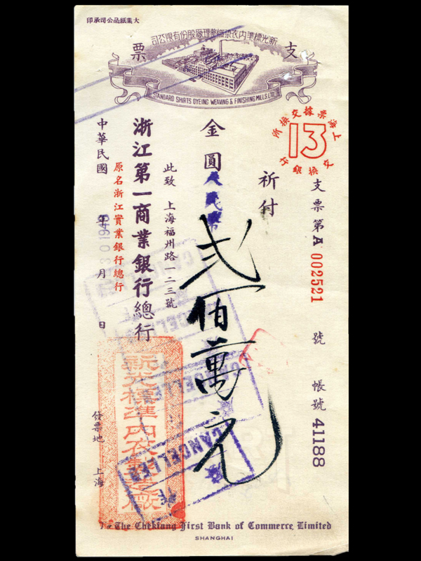 名称:支票 发行机构:江南第一商业银行 面额:200万元 签发时间:1948年 浙江第一商业银行前身为官商合办浙江银行,1910年创办,1911年改组为中华民国浙江银行,1912年改组为浙江地方实业银行。1923年官商 分营,上海、汉口划归商股,设浙江实业银行,1948年改组为浙江第一商业银行。