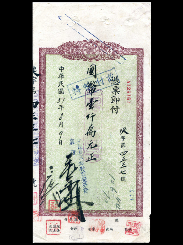 名称中国农民银行本票 发行机构:中国农民银行 面额:国币1000万元 签发时间:1948年8月9日 中国农民银行成立于1935年,其前身是豫鄂皖赣四省农民银行,总行设于汉口,同年,国民政府宣布中国农民银行为国家银行之一,继中央银行、中国银行、交通银行之后发行“法币”。