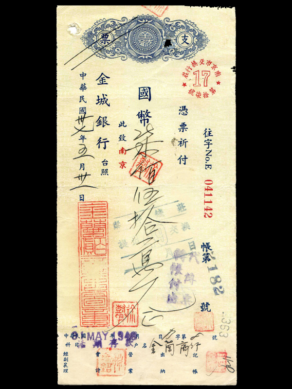 名称:金城银行支票 签发机构:金城银行 签发时间:1948年5月31日 面额:国币750万元 金城银行成立于1917年,总行设于天津,与盐业银行、中南银行、大陆银行被金融界统称为“北四行”