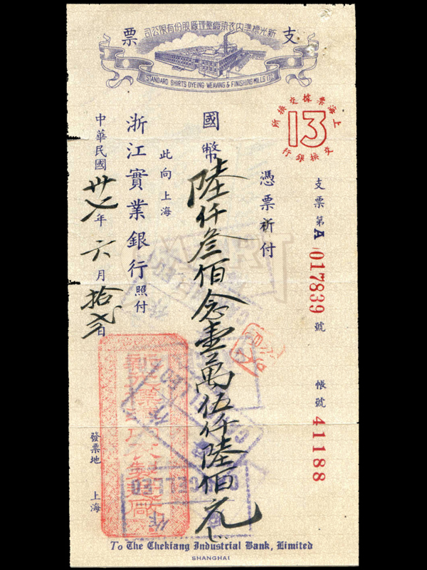 名称:汇票 发行机构:上海浙江实业银行 面额:国币6321.56万元 签发时间:1948年 浙江实业银行前身为官商合办浙江银行,1910年创办,1911年改组为中华民国浙江银行,1912年改组为浙江地方实业银行,1923年官商分营,上海、汉口划归商股, 设浙江实业银行,1948年改组为浙江第一商业银行。