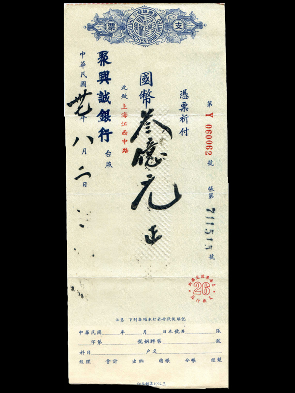名称:聚兴诚商业银行支票 发行机构:聚兴诚商业银行 签发时间:1948年8月2日 面额:国币3亿元 聚兴诚银行是一家历史甚久的川帮银行,成立于民国4年(1915年)3月,总行在重庆。曾为重庆最大的私营商业银行,也是川帮较大的商业银唯一无军政背景的民族资本银行。解放后,聚兴诚银行于1951年11月1日参加公私合营,从而结束了这家长达34年之久的杨氏家族银行。