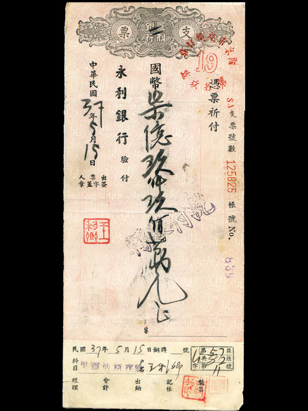 名称:永利银行支票 发行机构:永利银行 签发时间:1948年5月15日 面额:国币7.99亿元 1940年“裕大华”在原有钱庄基础上成立永利银行,1943年1月银行在重庆正式开业,设总行及总管理处。抗战胜利后,“裕大华”公司总部迁回汉口,即兴建永利大厦,作为永利银行总行,汉口分行及“裕大华”各部办公处所。