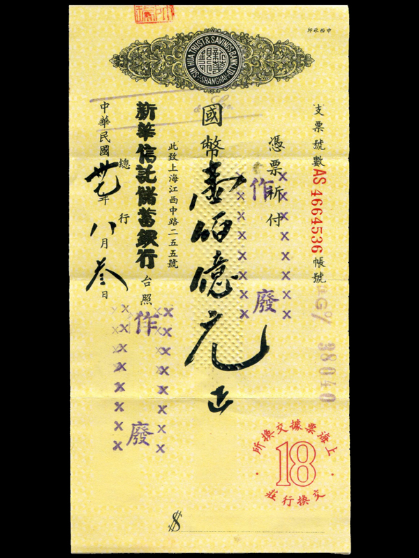 名称:新华信托储蓄银行支票 发行机构:新华信托储蓄银行 金额:国币100亿元 签发时间:1948年8月3日 新华信托储蓄银行由中资中国银行、交通银行于1919年联合创办,原名新华储蓄银行,1931年改组后更名为新华信托储蓄银行。1952年关闭。
