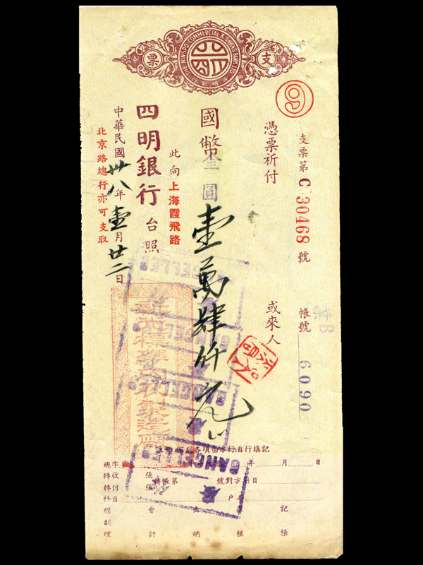 名称:四明银行支票 发行机构:四明银行 签发时间:1949年1月22日 面额:金圆一万四千元 四明银行创立于1908年,总行设于上海,是旧中国主要商业银行之一。1935年因滥发银行券,发生挤兑,四大家族官僚资本乘机加以控制,加入大量“官股”,是小四 行成员之一。