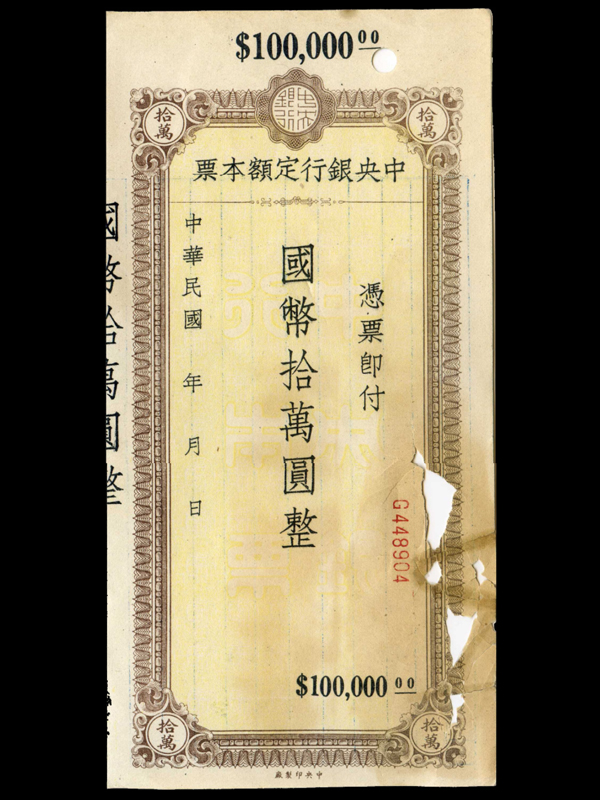 名称:中央银行定额本票 发行机构:中央银行 面额:国币10万元 中央银行成立于1928年,初总部设于上海,后辗转 于重庆、上海、广州,1949年随国民政府迁往台湾。
