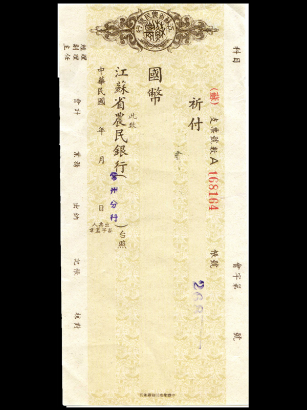 名称:江苏农民银行支票 签发机构:江苏农民银行常州分行 苏省农民银行创立于民国17年,由江苏省政府财政厅长张寿镛提议创设,总行设在镇江。