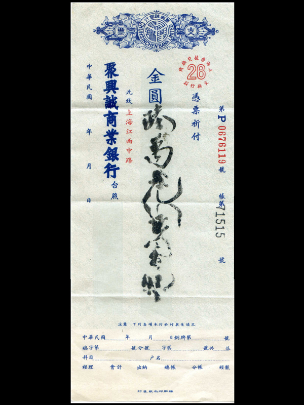 名称:聚兴诚商业银行支票 发行机构:聚兴诚商业银行 面额:6万金元 聚兴诚银行是一家历史甚久的川帮银行,成立于民国4年(1915年)3月,总行在重庆。曾为重庆最大的私营商业银行,也是川帮较大的商业银唯一无军政背景的民族资本银行。解放后,聚兴诚银行于1951年11月1日参加公私合营,从而结束了这家长达34年之久的杨氏家族银行。