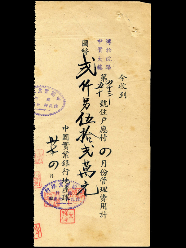 民国37年中国实业银行地产科收据(国币2052万元)