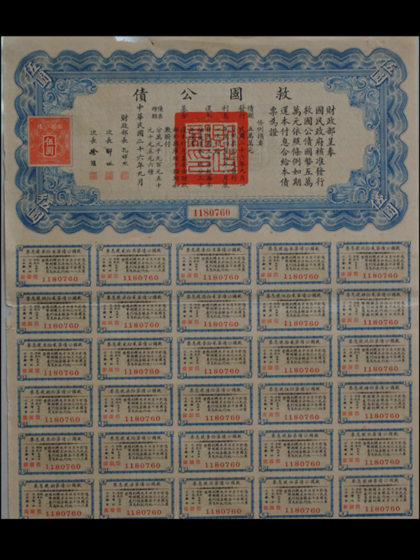 民国26年财政部救国公债(5元)