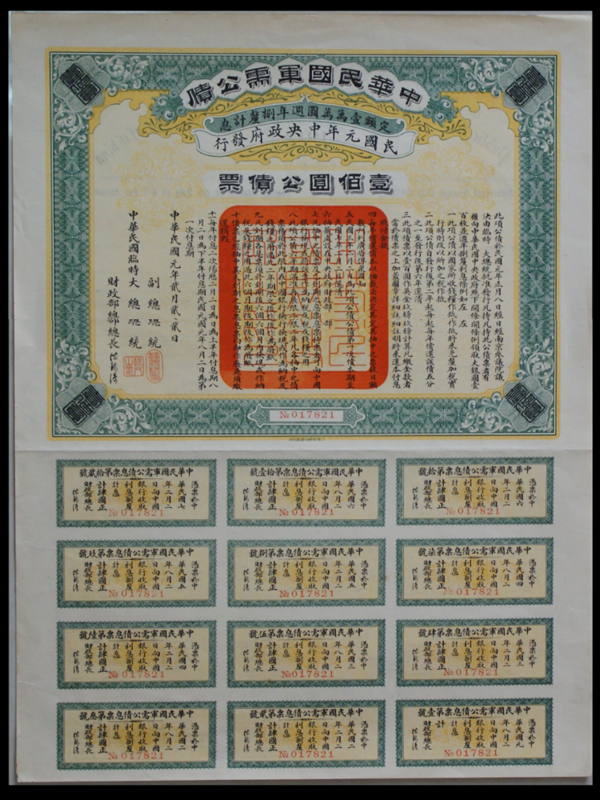 名称:中华民国军需公债 面额:一百元 发行时间:1912年 期限:5年