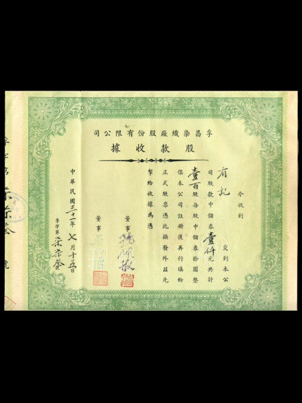 民国31年孚昌染织厂股份公司股款收据(100股)