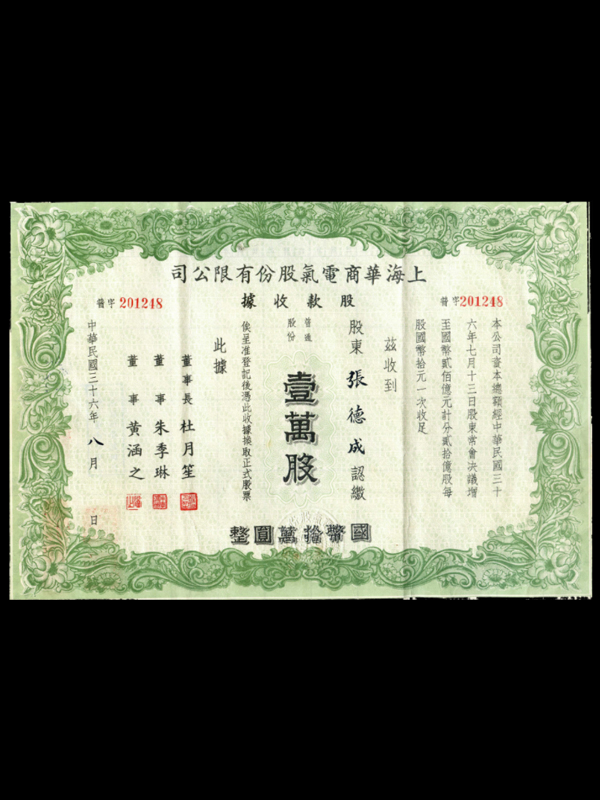 民国36年上海华商电气股份有限公司股款收据(1万股)