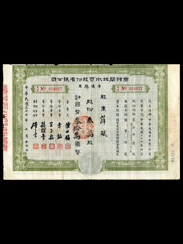 民国37年商办闸北水电股份有限公司普通股票(3万股)