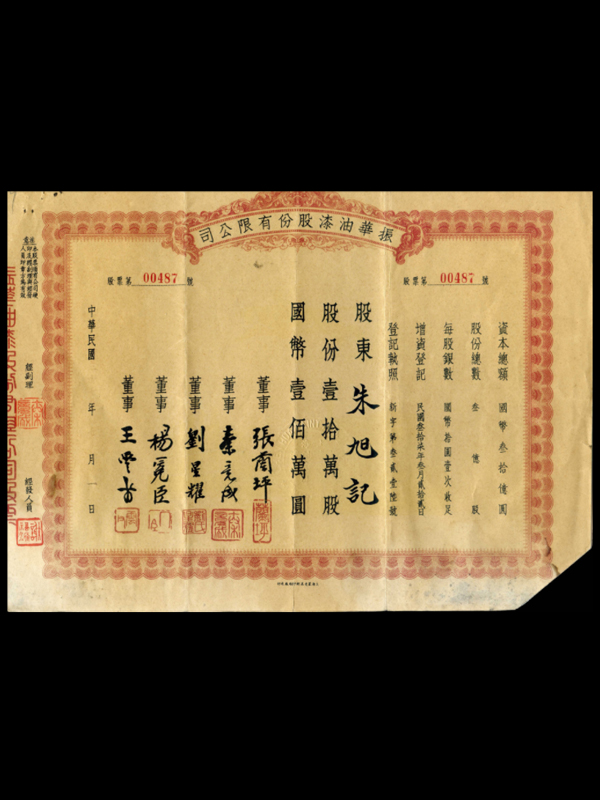 名称:股票 发行机构:振华油漆股份有限公司 面额:100万元 股份:10万股 发行时间:未填写