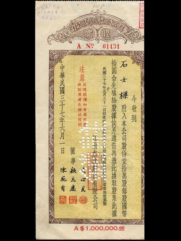 名称:股据 发行机构:江南水泥股份有限公司 面额:100万元 股份:10万股 发行时间:1948年6月1日