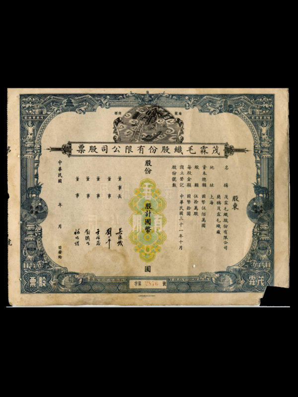 名称:股票 发行机构:茂霖毛织股份有限公司 面额:500万元 股份:50万股 发行时间:1942年10月