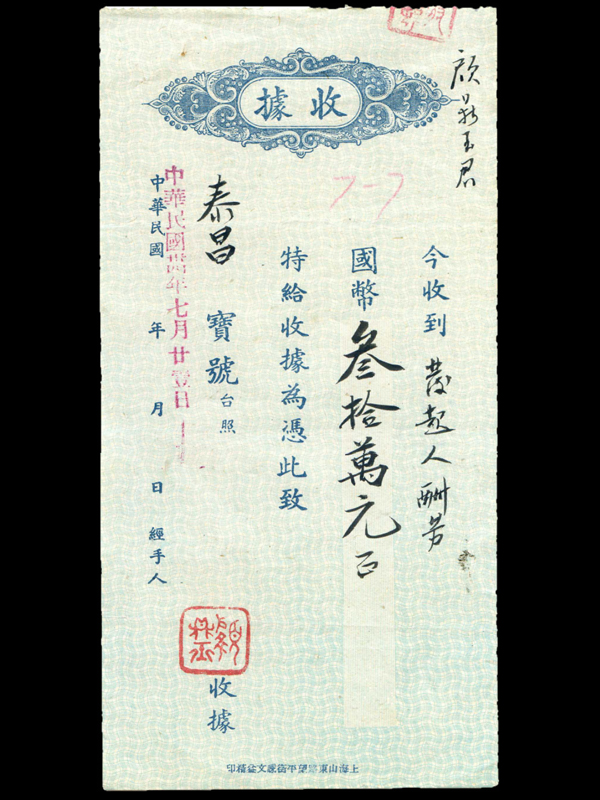 名称:收据 面额:30万元 签发人:泰昌 签发时间:1945年7月21日