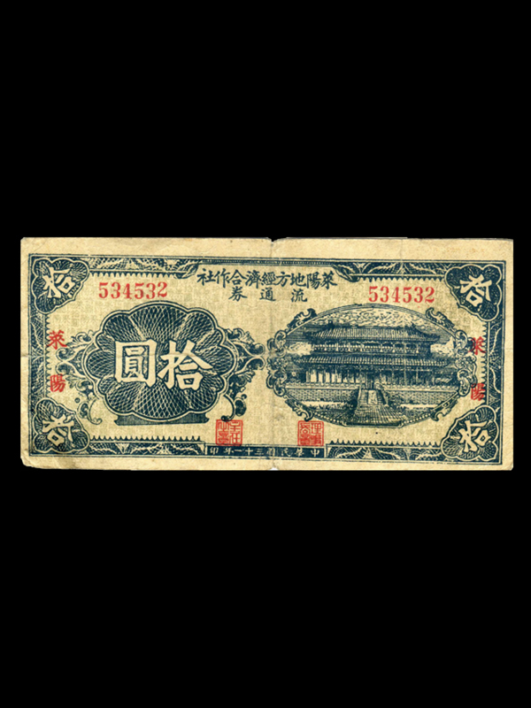 名称:莱阳地方经济合作社流通券 面额:十元 一直时间:1942年