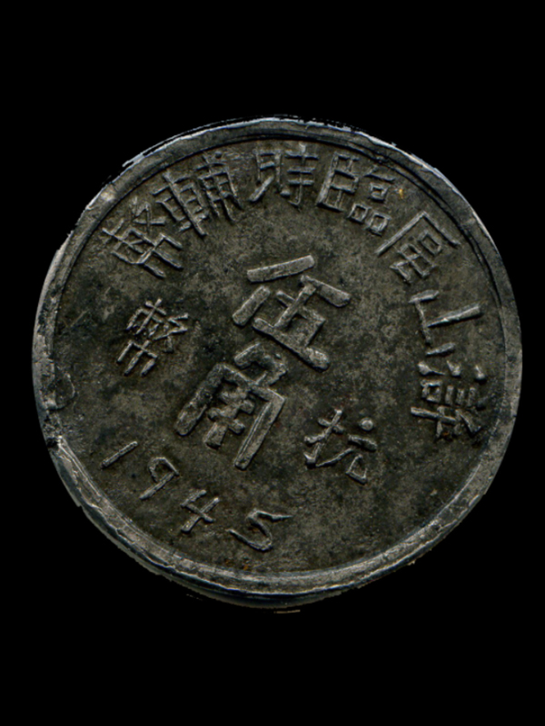 浙东根据地货币,锡铅质,重10.7克,直径32mm。正面为“浒山区临时辅币”、“抗币”、“伍角”及铸造时间“1945”。背面无图案。