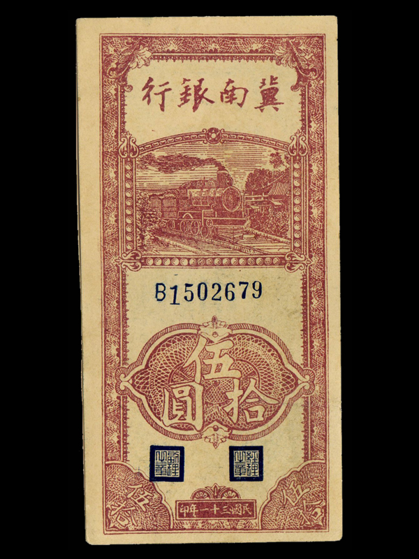 纵版。正面:红色;票面上方为行名,其下为火车图案;中部为票号;下方为面额“伍拾圆”、经理之章、副理之章和印制年份“民国三十一年印”;下方两角为面额“伍拾”。背面蓝色,英文字样,上方行名,中部为面额50、英文伍拾元及公元纪年1942,四角印有 “50”字样。