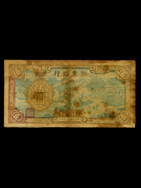 正面:红色;票面上方为行名;左侧印有面额“伍圆”,右部为古代农村劳作图案水墨画,四角印有面额“伍”字样;下方印有“浙东地方本位币”、浙东银行总经理章、浙东银行副经理章及印制时间“中华民国三十四年印”字样。背面蓝色,英文字样,上方为行名,中部为与正面对应的农村劳作图案,图案左右为面额“5”,下方印有印刷年份“1945”,四角印有面额“5”字样。