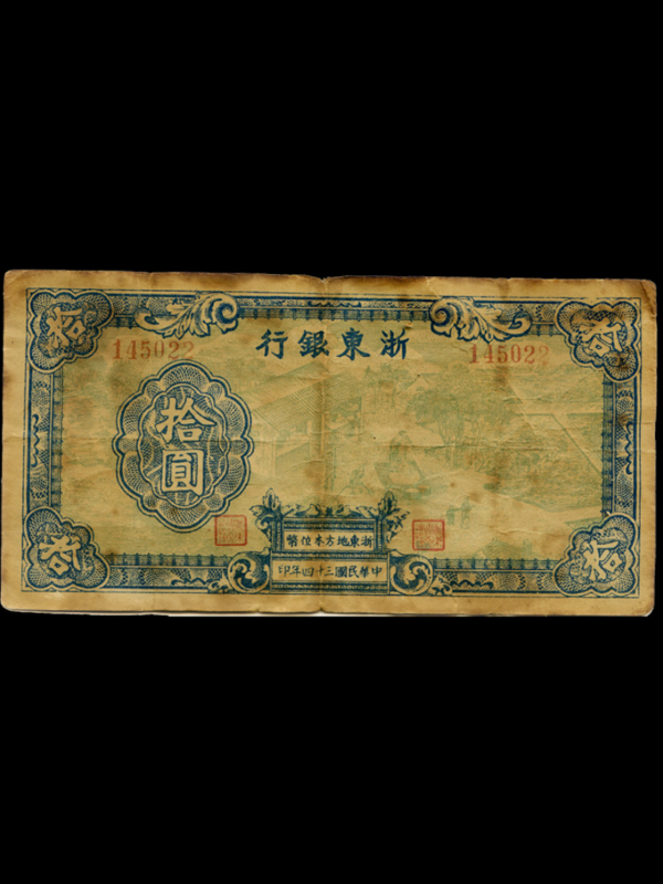 正面:蓝色;票面上方为行名及票号;左侧印有面额“拾圆”,右部为古代农村劳作图案水墨画,四角印有面额“拾”字样;下方印有“浙东地方本位币”、浙东银行总经理章、浙东银行副经理章及印制时间“中华民国三十四年印”字样。背面蓝,英文字样,上方为行名,左部为面额“10”,右部为与正面对应的农村劳作图案,下方印有印刷年份“1945”,四角印有面额“10”字样。