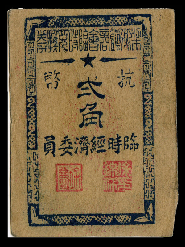 浙东抗日根据地流通货币。是浙东地区广大人民在抗日战争统一战线政策的感召下,为解决根据地部队给养,由梁弄镇商会的经商者自发成立了镇临时经济委员会,并以商会名义发行的“抗币”。纵版,币纸土黄色高83毫米,宽53毫米。正面:蓝色,上方为篆体“梁弄镇商会临时兑换券”;中部喂五角星图案及面额“贰角”,面额两侧有“抗币”两字,下方为“临时经济委员”及商会会长徐锦祥、副会长徐益明印章。背面:红色。中间有“20”字样,下方为印制时间“1945”年。