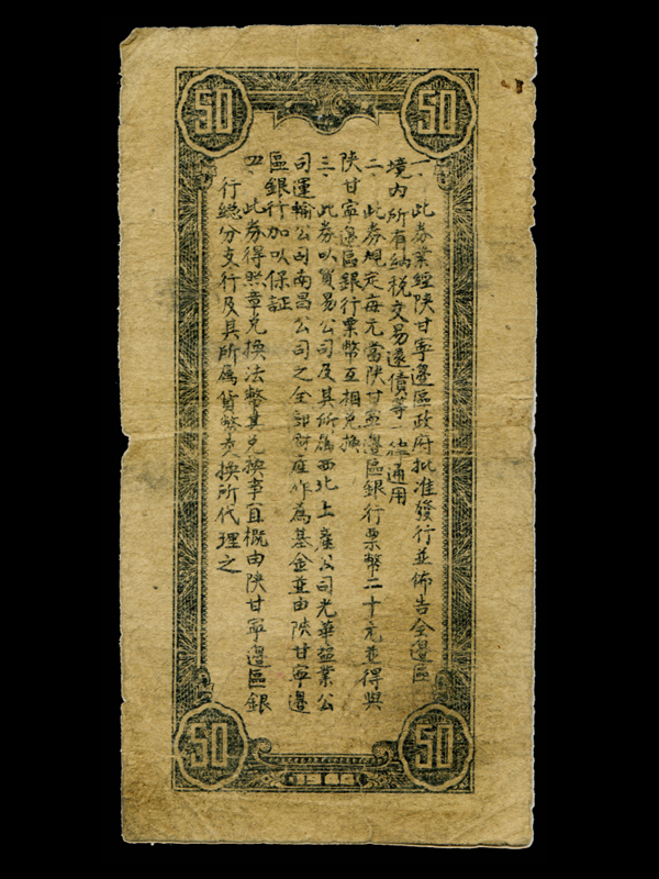 纵版。正面:蓝色,上端为票号及券名;中部为面额“伍拾圆”及“叶季壮”、“范子文”签名;下端为票号及印制时间“中华民国三十三年”;四角为面额“伍拾”字样。背面:墨绿色,四角为面额“50”字样,中部为使用说明四条,下方为印制时间“1944”。