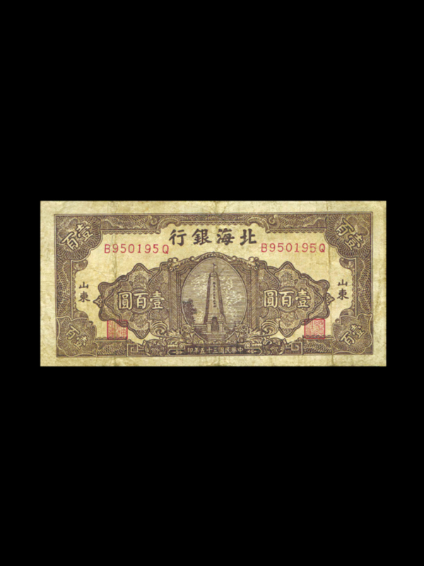 正面:褐色;票面上方为行名及票号;中部为胶东抗日烈士纪念塔图案。图案左右两侧为面额“壹百圆”及地名“山东”和总经理、经理方章;四角印有面额“壹百”字样;下方为印制时间“中华民国三十五年印”字样。背面蓝色,英文字样,上方为行名,中部及四角印有面额“100”,下部印有印制时间“1946”。