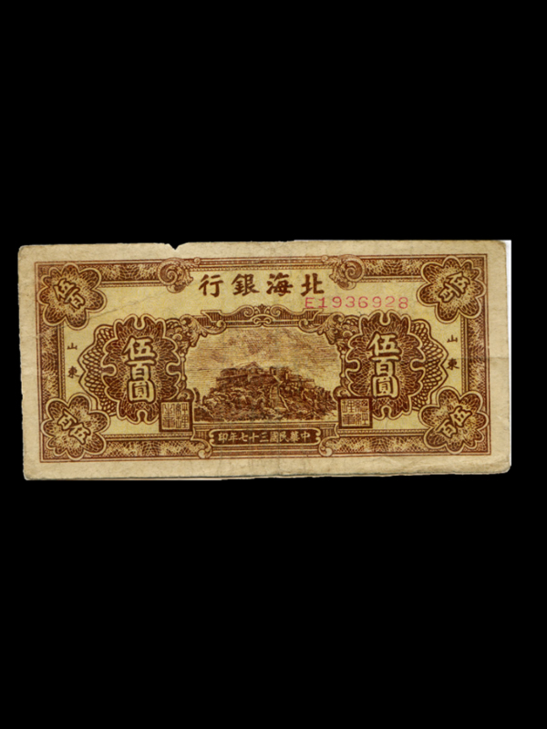 正面:棕色;票面上方为行名及票号;中部为泰山玉皇顶图案。左右两侧为面额“伍百圆”,其下方为“总经理章”、“经理之章”;两段印有地名“山东”;四角印有面额“伍百”;最下方为印制时间“中华民国三十七年印”字样。背面绿色,中部及四角印有面额“500”,下方为印制时间“1948”。